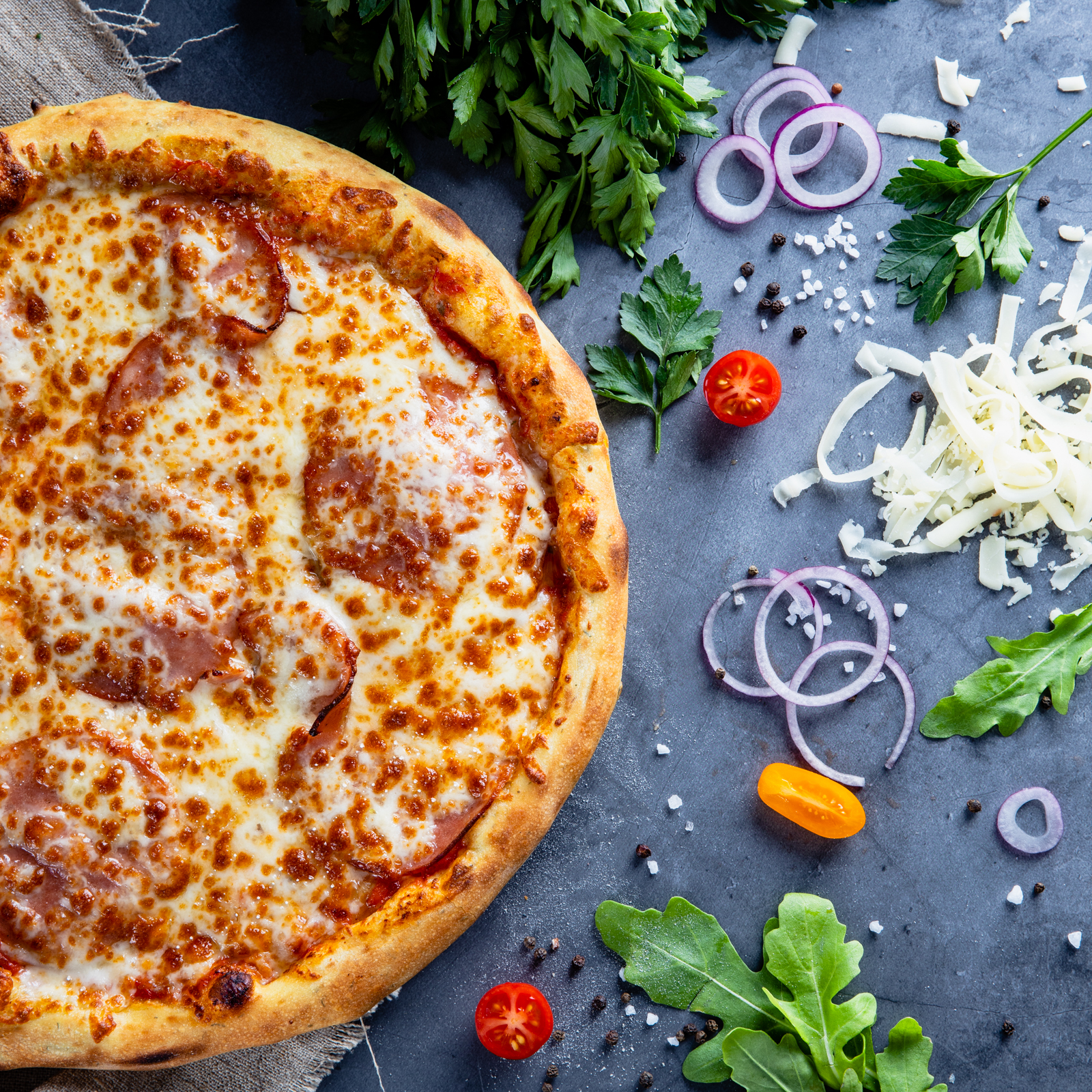 Ulei de măsline, sos de roșii, mozzarella, șuncă, salam, ciuperci, ceapă, ardei gras, cabanos, porumb, oregano.