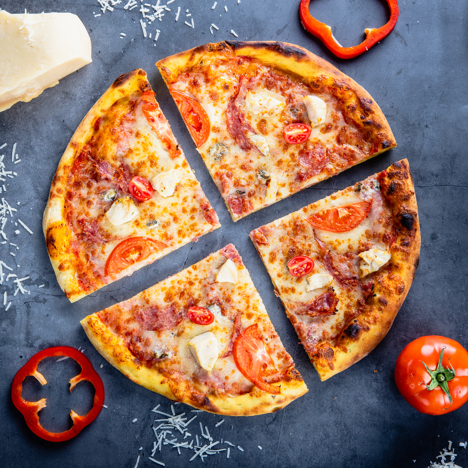 Ulei de măsline, sos de roșii, mozzarela, salam uscat, gorgonzola, piept de pui, roșii, busuioc verde, oregano.
