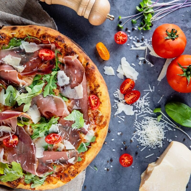 Ulei de masline , sos de rosii , mozzarella , prosciutto crudo , parmezan, rosii chery, rucola , oregano.